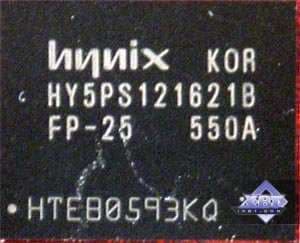 | Карта имеет 256 МБ памяти GDDR2 SDRAM, размещенной в 4-х микросхемах на лицевой и оборотной сторонах PCB. Микросхемы памяти Hynix (GDDR2). Время выборки у микросхем памяти 2.5ns, что соответствует частоте работы 400 (800) МГц. | ![]() |