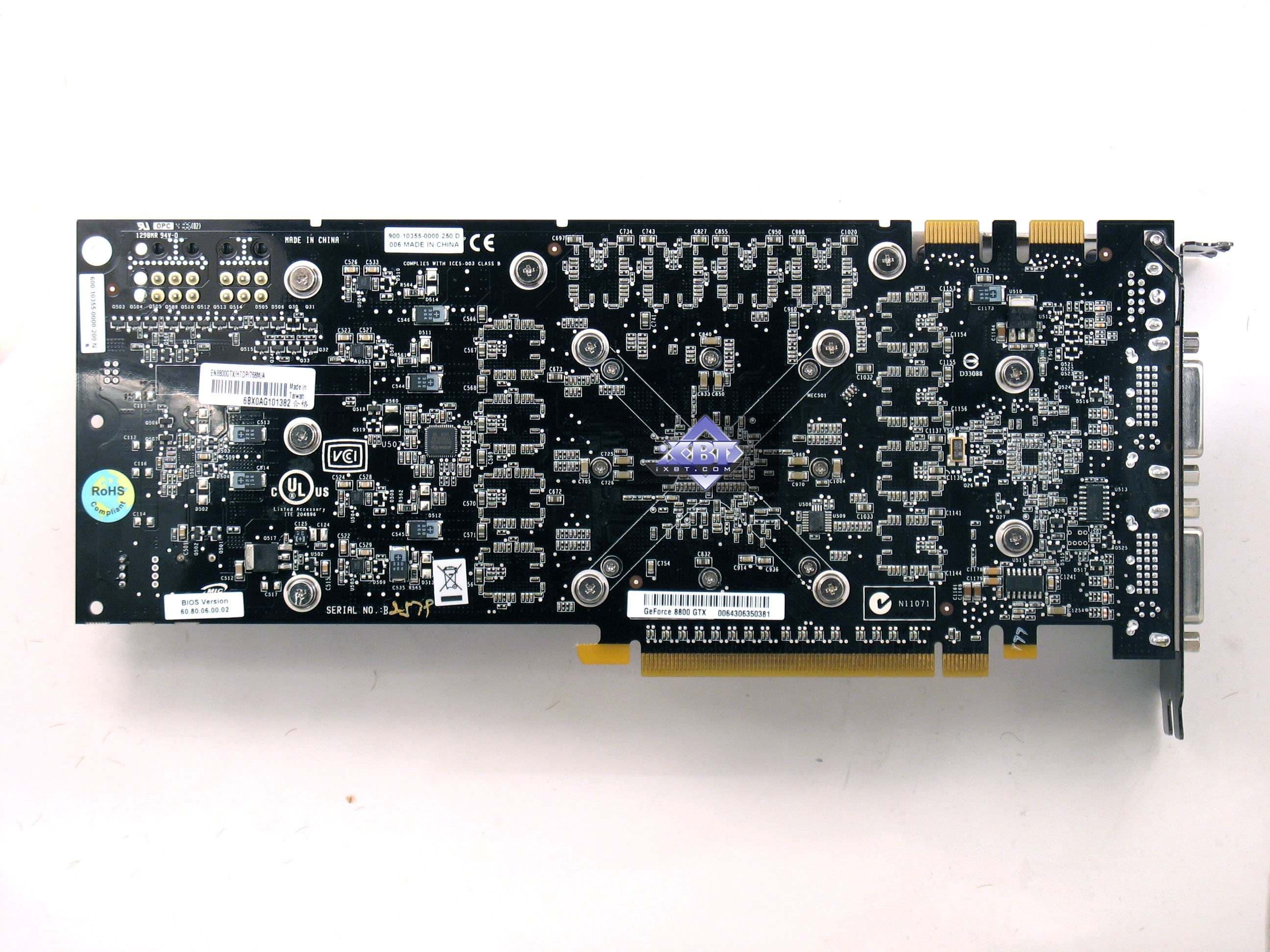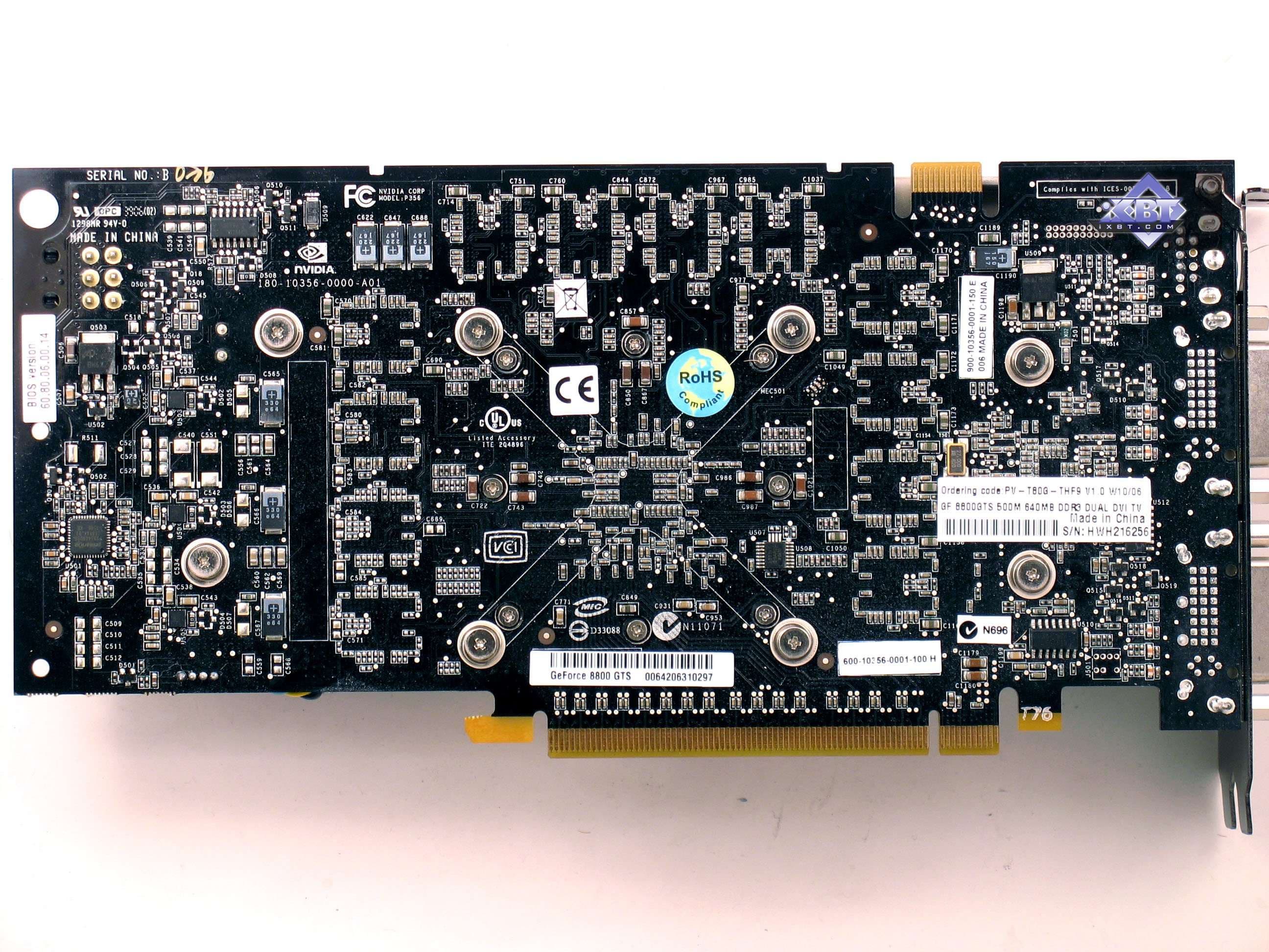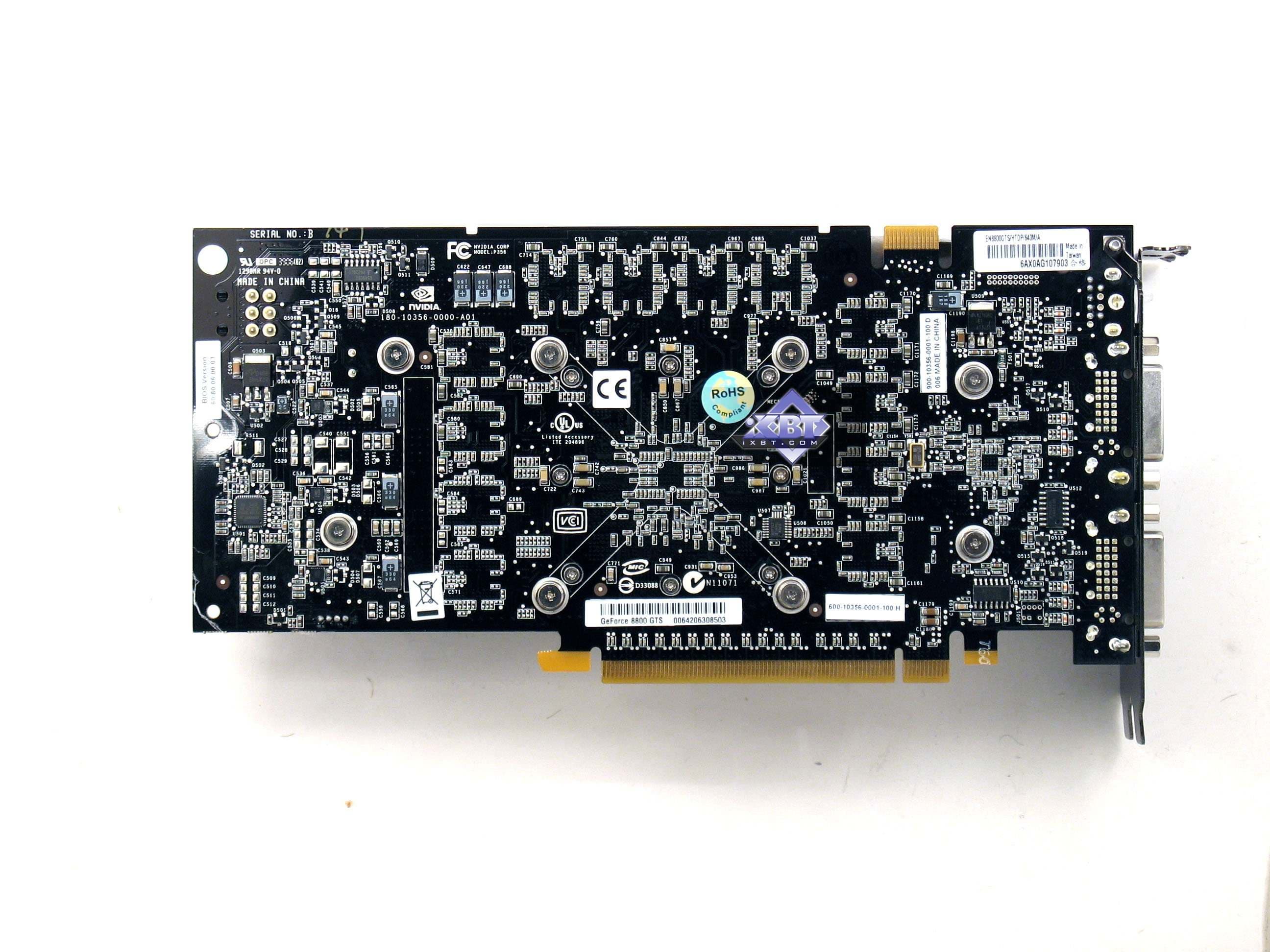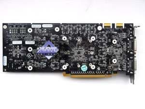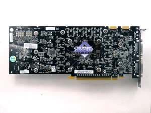 Плата на базе 8800GTS имеет PCB также с разведенной на ней 384-битной шиной, из которых реально используется только 320бит, поскольку двух микросхем физически нет, есть только пустые места под них. Как-то же нужно урезать хай-энд, чтобы получить и более дешевые решения. Кстати, есть сведения, что именно эта разводка, только лишь чуть усиленная, но с той же длиной PCB послужит основой для обновленного выпуска 8800GTX, когда такие карты будут иметь длину уже не 270, а 220 мм.