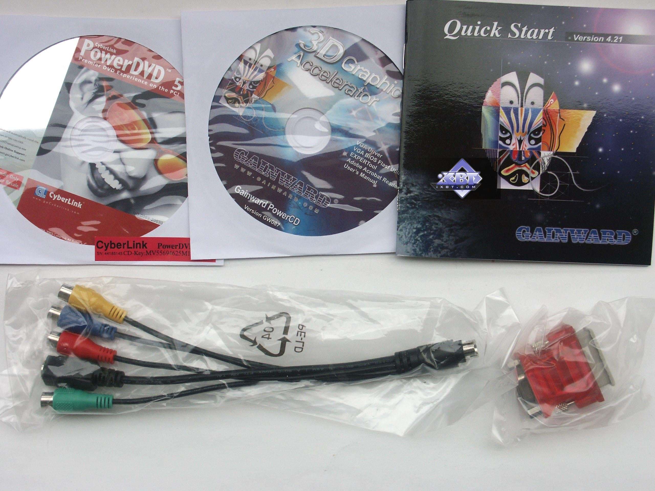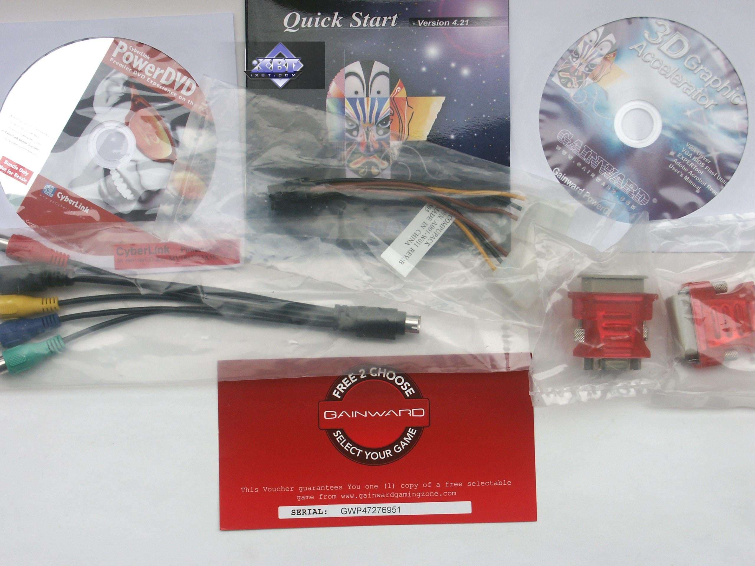 | Традиционный очень скромный комплект от Gainward. Руководство пользователя, CD с драйверами, PowerDVD устаревшей версии; переходник DVI-to-d-Sub, адаптер для S-Video/RCA/композитного вывода. | ![]() |