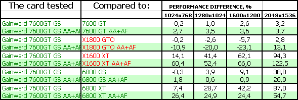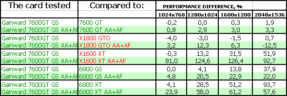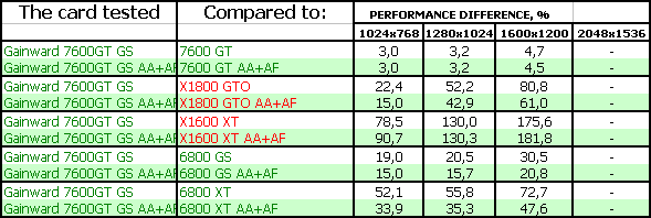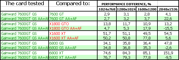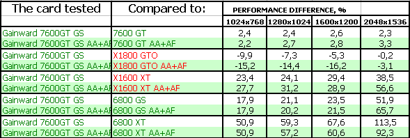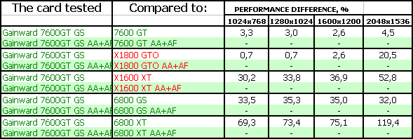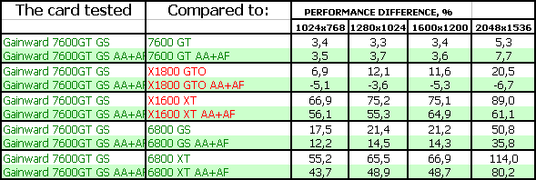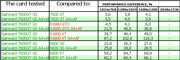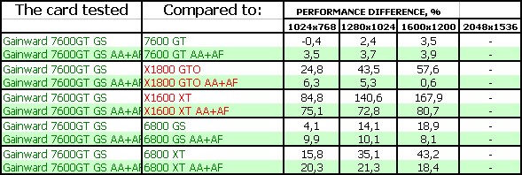 - Gainward Bliss 7600 GT Golden Sample 256MB PCI-E. Тесты показали, что эта видеокарта просто отличный выбор для потенциального геймера, стремящегося купить хороший ускоритель за 220-240 долларов США (в дальнейшем цены должны упасть до 200 и ниже). Карта на своих штатных частотах подчас догоняет более дорогой X1800 GTO. Продукт очень хороший во всех отношениях! Да, есть минусы в режиме АА+АФ, где у X1800 GTO появляется преференция из-за 256-битной шины, но все же в целом резюме положительное.