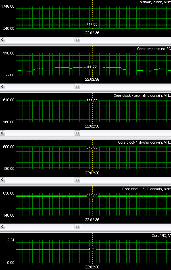 Мониторинг, проведенный с помощью утилиты RivaTuner (автор А.Николайчук AKA Unwinder), показал, что даже такая тихая система охлаждения прекрасно справляется с нагревом GPU, который, к тому же, еще и работает на повышенных частотах.