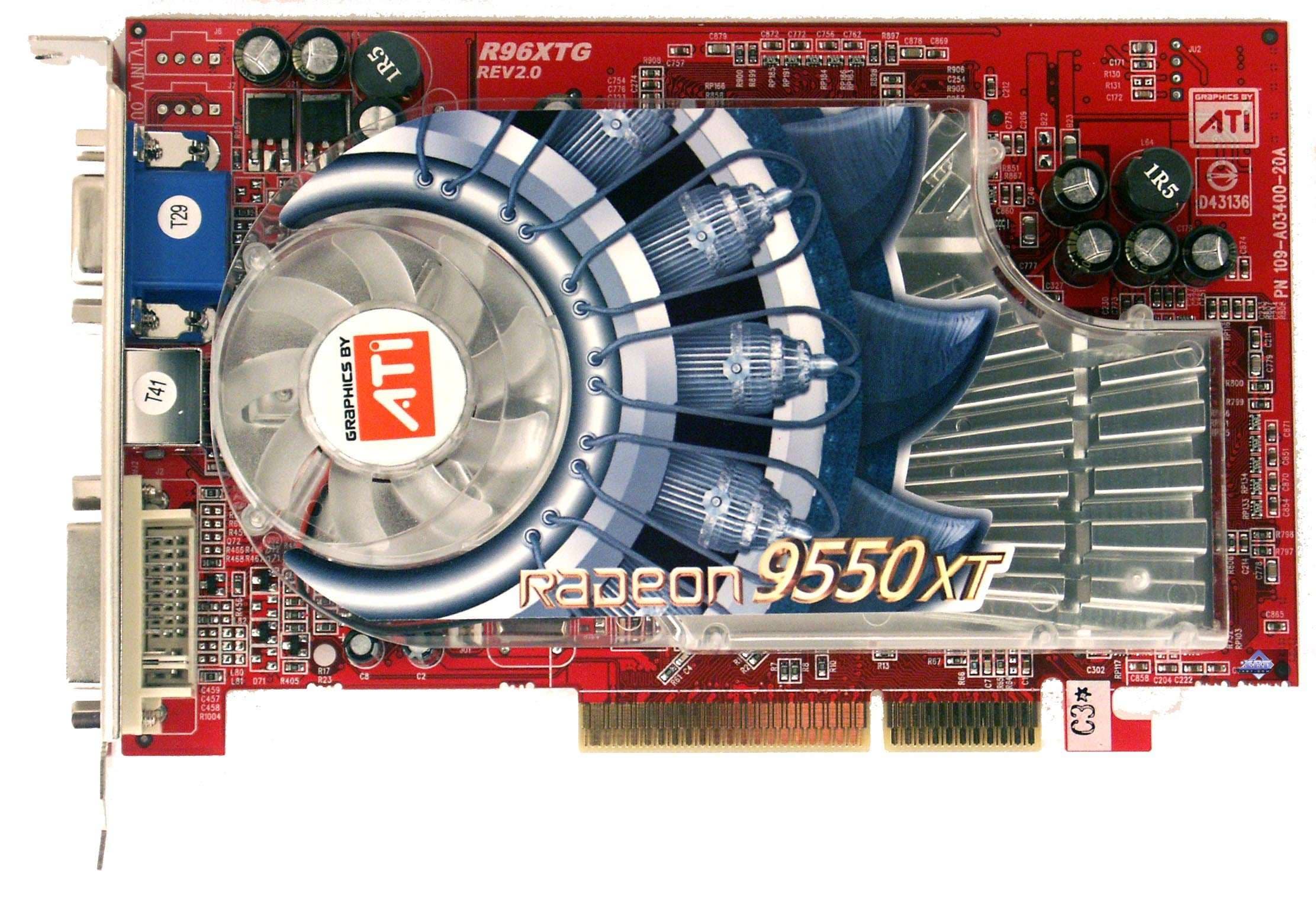 А вот GeCube RADEON 9550 XT Extreme очень интересна. Как мы видим, у карты дизайн хоть и схож с RADEON 9600 XT (не случайно сравнение было именно с ним, ведь на PCB карты есть условное обозначение RG96XT, что явно говорит о том, что PCB принадлежит к 9600 XT), но имеет свои отличия, связанные, прежде всего, с тем, что на плате есть разводка под RAGE Theater (VIVO), хотя сам кодек не установлен.