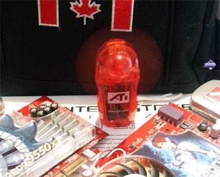 Дизайн явно стилизован под известную систему охлаждения от RADEON 9800 XT. В общем-то, потребность в таком кулере, наверно, имеется, поскольку ядро сильно разогнано с 250 до 400 МГц (как выяснилось позже, все же там RV360, а не RV350, и поэтому работа на 400 МГц вполне возможна, хотя маркировка у чипа — 9550)