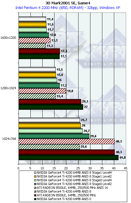 Затем мы видим, что производительность Ti 4200 при понижении степени анизотропии для каждой текстурной стадии практически одинакова. Поэтому для Game1 можно рекомендовать Level2 для Stage1.