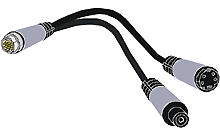 Как ясно из описания карты, она имеет два выхода на VGA-мониторы (15-pin) и комбинированный разьем аналогового видеосигнала. Одно из назначений этого разьема - вывод аналогового видеосигнала на телевизор или аналогичные по назначению устройства (TV-out). Второй VGA-выход функционально совмещен с аналоговым выходом TV-out и использоваться одновременно они не могут. В настройках видеокарты в качестве второго выхода выбирается либо "VGA-дисплей", либо "телевизор". Подключение к телевизору осуществляется через переходник, на конце которого имеется композитный и S-Video-разьемы:
