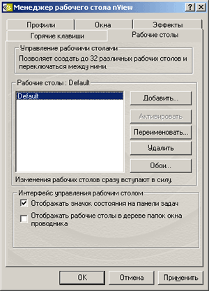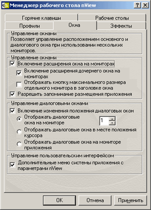 Для разных задач пользователем создаются отдельные профили. Дополнительно nView запоминает размещение приложений на экране, предлагает броузер рабочих столов Windows, реализует частичную прозрачность для перекрывающихся или перетаскиваемых окон, ускоряет развертывание окон и пр.