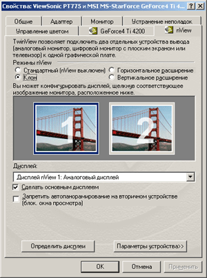 Исследования я начал с детального изучения мультимониторных возможностей платы. А их оказалось довольно много. Плата позволяет растягивать на второй монитор рабочий стол Windows (как по горизонтали, так и по вертикали). Причем разрешения и развертки у мониторов устанавливаются независимо. В режиме клонирования содержимое второго монитора полностью или частично повторяет картинку основного монитора. Если разрешение у второго меньше чем у первого, то выводится только часть экрана, которая перемещается вслед за мышиным указателем так называемый "виртуальный экран" или автопанорамирование). Дополнительно для каждого монитора задается раздельная цветокоррекция, тип развертки и синхронизации, сглаживание, растягивание изображения и пр.: