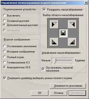 Из неудобств следует отметить, что если в качестве второго монитора выбран аналоговый выход TV-out, то реально выводимое на экран изображение имеет всего два значения разрешения: 640х480 и 800х600 (NTSC и PAL соответственно). Отображение бОльших разрешений основного монитора возможно только через виртуальный экран. В режиме PAL изображение легко растягивается на весь телевизионный монитор. Т.е. удается полностью устранить черные поля по краям выводимой рабочей области изображения. А вот в режиме NTSC полностью растянуть картинку по вертикали не удается. Поля неизбежно присутствуют.