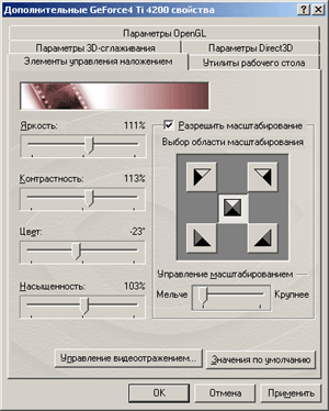 Другое, не менее полезное применение второго выхода платы, это полноэкранное отображение окна видеооверлея. В простейшем случае результата можно достичь, развернув воспроизводимое изображение на полный экран (например, в медиаплеере Windows). Но плата предоставляет и более совершенные средства. Называется это "элементы управления наложением" :