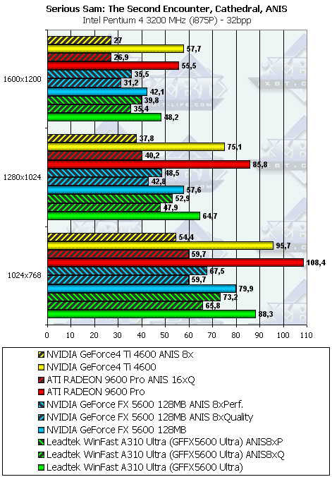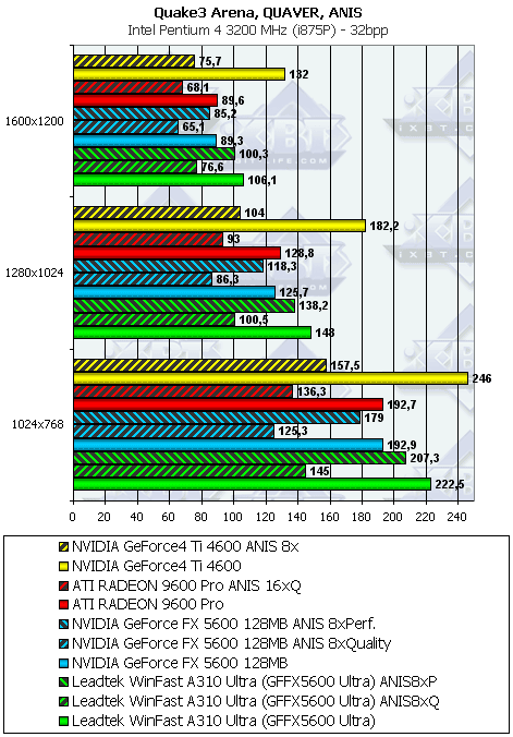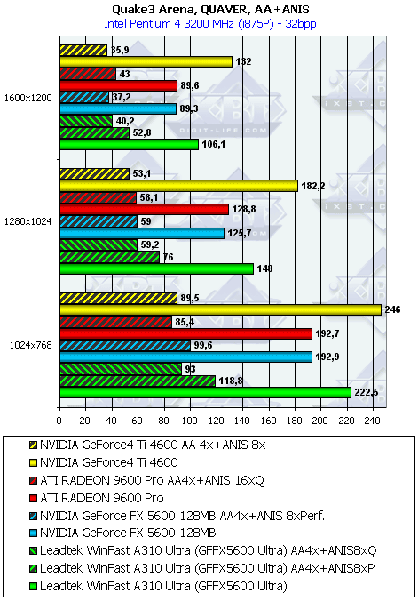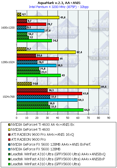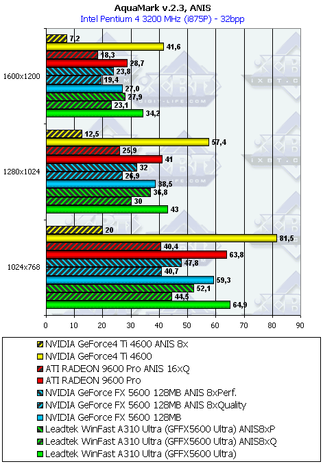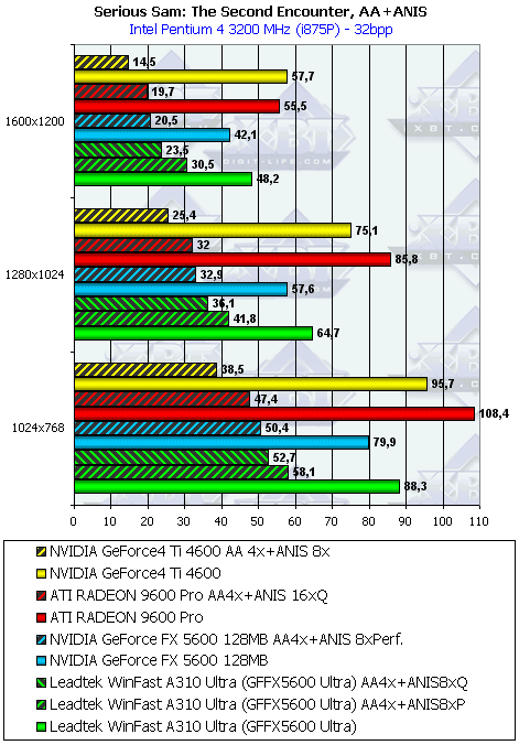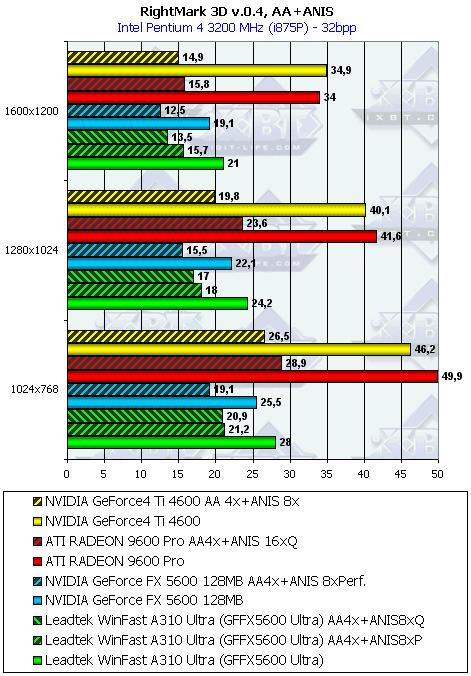 Leadtek WinFast A310 Ultra MyVIVO может дать пользователю:- более высокую скорость в АА и/ или анизотропии, нежели соперники (RADEON 9600 PRO или GF4Ti 4600);
