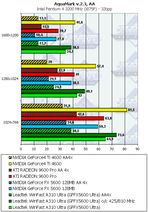 | Leadtek FX5600 U AA4x+ANIS8xQ | GF4 Ti 4600 AA 4x+ANIS 8x | 36,9 | 42,1 | 62,1 |