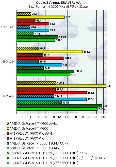 | Leadtek FX5600 U AA4x+ANIS8xQ | GF4 Ti 4600 AA 4x+ANIS 8x | 111,6 | 137,0 | 148,8 |