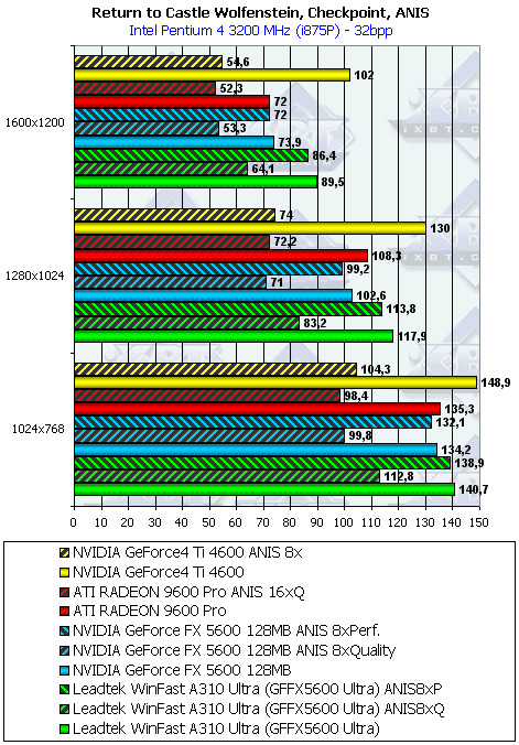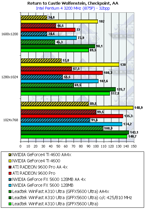 - Return to Castle Wolfenstein (MultiPlayer) (id Software/Activision) — OpenGL, мультитекстурирование, Checkpoint-demo, настройки тестирования — все на максимально возможном уровне, S3TC OFF, конфигурации можно скачать тут