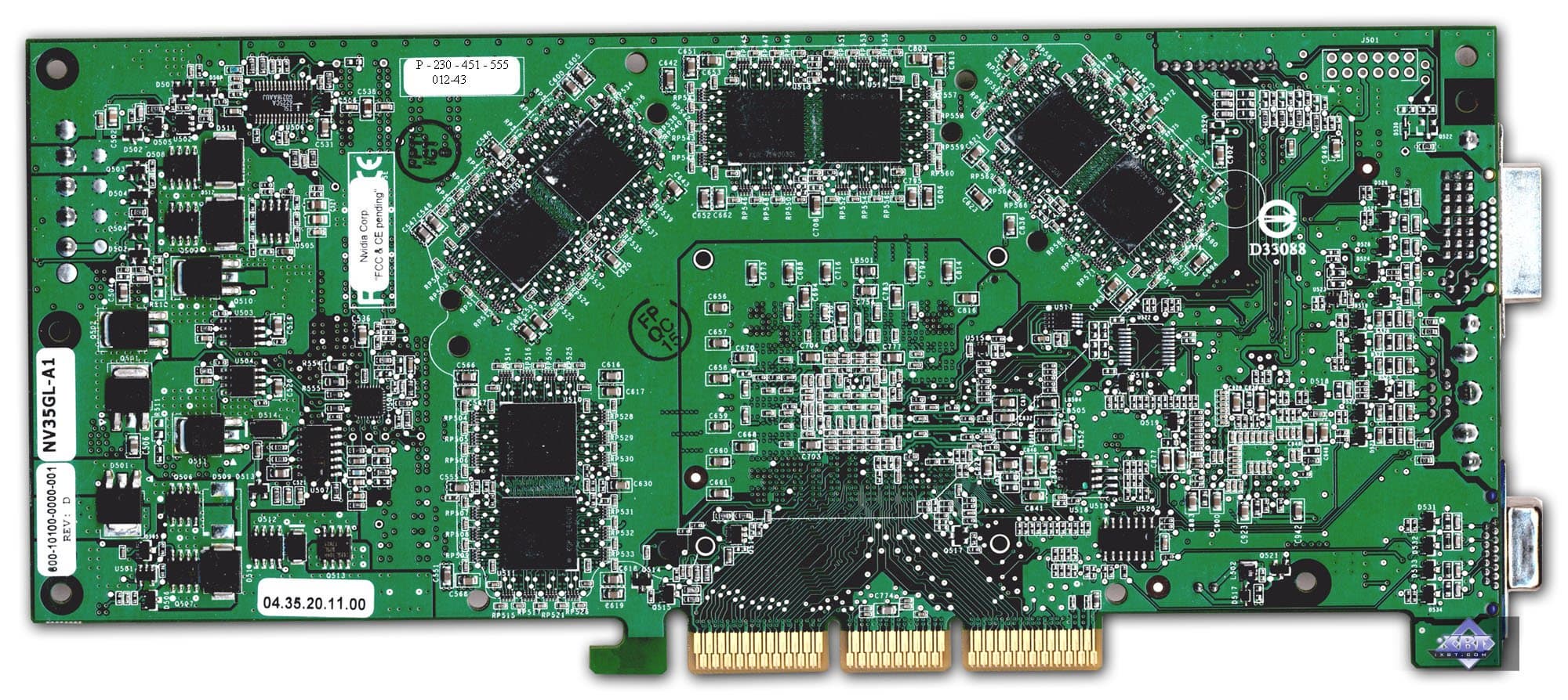 - Уменьшение объема памяти с 256 до 128 мегабайт получилось путем недокомплектации микросхемами памяти (на оборотной стороне можно увидеть пустые места под BGA-микросхемы. Однако 256-битная шина не обрезалась, ведь на карте установлено 8 32-битных микросхем памяти (то есть всего 256бит). Просто уже невозможен так называемый двубанковый режим работы памяти.