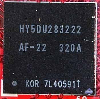 | Микросхемы памяти производства Hynix. Время выборки у микросхем памяти 2.2ns, что соответствует частоте работы примерно 454 (908) МГц, память же работает на частоте 425 (850) МГц. Частота работы GPU — 400 MHz. Интерфейс обмена с памятью — 256 бит. | ![]() |