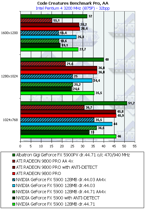 Проверить невозможно, поэтому мы не можем на 100% обвинять NVIDIA в "заточках" подобного рода. Можем лишь констатировать, что картина изменилась. Специалисты из NVIDIA умолчали про Code Creatures BenchMark Pro, хотя тестирование с Anti-Detect показало, что "заточки" есть. Почему именно cheats, а не оптимизации? Потому что такой игры не существует. Это всего лишь бенчмарк, хоть и на игровом движке. А это значит, что любые изменения, внесенные драйверами в ход процесса, будет противоречить тому, что задумывалось авторами теста. То же самое касается и AquaMark, поэтому мы с последним расстались.