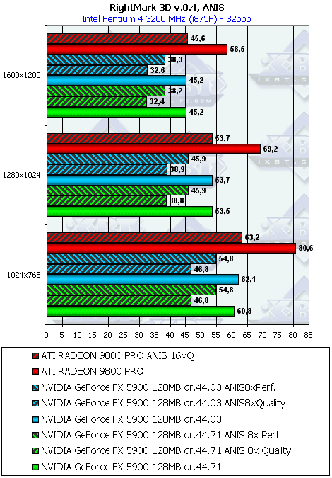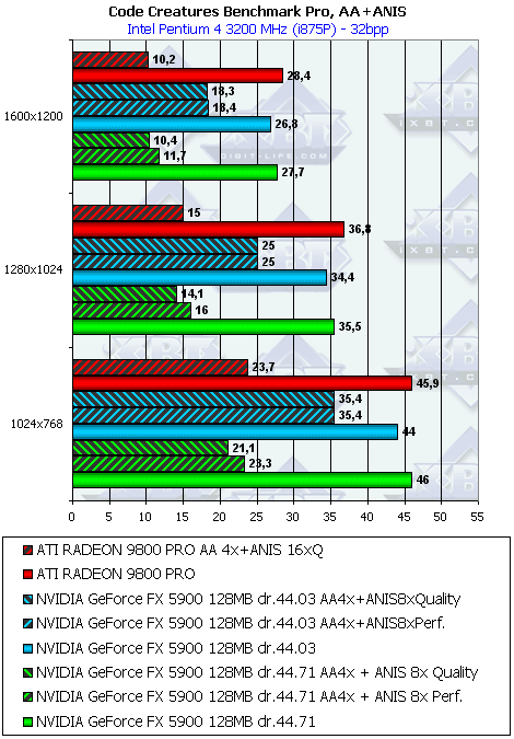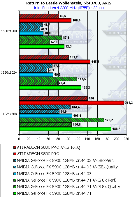 Разницы между версиями драйверов нет. Что касается соперничества с RADEON 9800 PRO, то в тяжелых режимах FX 5900 вырывает победу за счет более быстрого АА и анизотропии класса Performance (я повторю, почему мы сравниваем этот класс анизотропии у GeForce FX с Quality у RADEON 9800: в этом случае обе реализации функции имеют ряд упрощений, у ATI это понижение степени функции на ряде углов, у NVIDIA — упрощение трилинейки и самой анизотропии на дальних текстурах; поэтому по сумме плюсов и минусов можно признать их где-то равноправными, хотя мы приводим и сравнение Quality с Quality для тех, кто уверен, что "ущербную" в силу своих особенностей анизотропную фильтрацию у ATI совместно с полноценной трилинейкой надо сравнивать только с полноценной без упрощений анизотропией от NVIDIA).