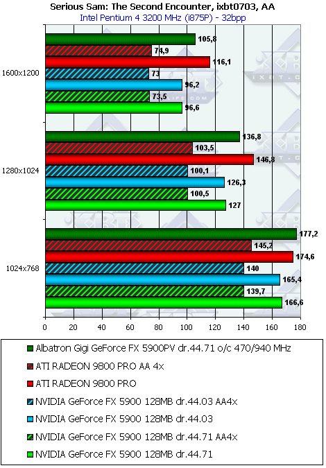 - Serious Sam: The Second Encounter v.1.05 (Croteam/GodGames) — OpenGL, мультитекстурирование, ixbt0703-demo, настройки тестирования: quality, S3TC OFF