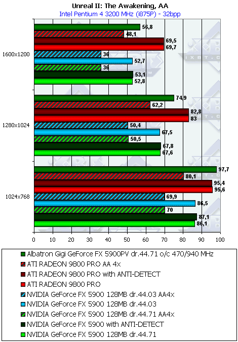 Хотелось бы отметить дальше, что почему-то не были обнаружены "заточки" под Unreal II. А ведь странно: игра вышла достаточно давно, пора бы давно оптимизации сделать и под нее, благо что движок у UT2003 и Unreal II один и тот же. Только почему-то под UT2003 были сделаны, по словам специалистов NVIDIA, "оптимизации", а под Unreal II — нет. Не является ли причиной этой разницы тот факт, что в Unreal II нет встроенного и открытого бенчмарка? А в UT2003 он есть. Читателям следует задуматься.