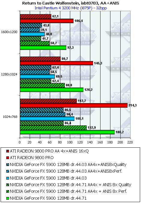 - Return to Castle Wolfenstein (MultiPlayer) (id Software/Activision) — OpenGL, мультитекстурирование, ixbt0703-demo, настройки тестирования — все на максимально возможном уровне, S3TC OFF, конфигурации можно скачать тут
