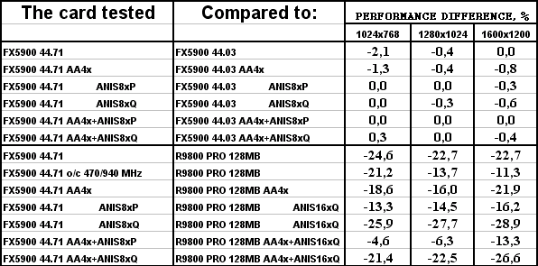 Разницы между версиями драйверов нет. И, увы, FX 5900 везде проиграл сопернику, и подчас с крупным счетом.
