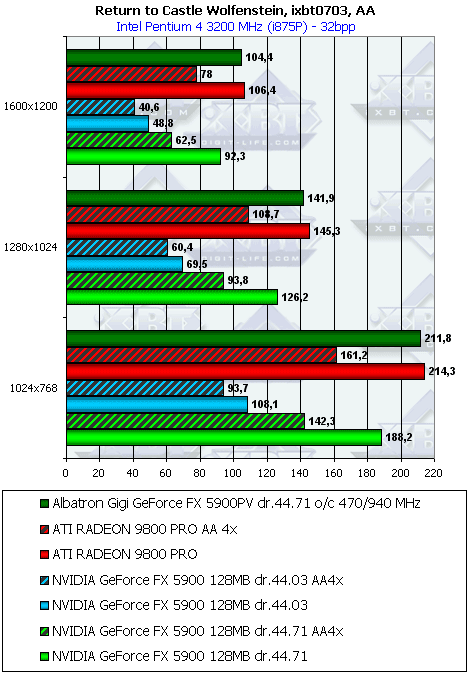 - Return to Castle Wolfenstein (MultiPlayer) (id Software/Activision) OpenGL, мультитекстурирование, ixbt0703-demo, настройки тестирования все на максимально возможном уровне, S3TC OFF, конфигурации можно скачать тут