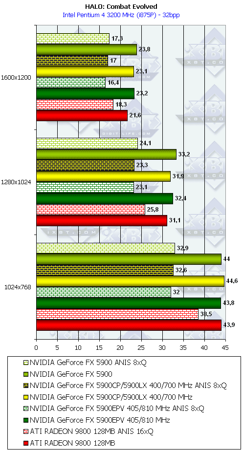 В самом начале статьи прозвучал оптимизм по поводу того, что видеокарты, имеющие значительно меньшую, чем у FX 5900, цену, снабжены по сути теми же графическими процессорами FX 5900, а значит, есть шанс, что они составят сильнейшую конкуренцию продукту RADEON 9800, имеющему более низкие частоты ядра и памяти, нежели у RADEON 9800 PRO. Однако, наши тесты показали, что все намного более безрадостно: