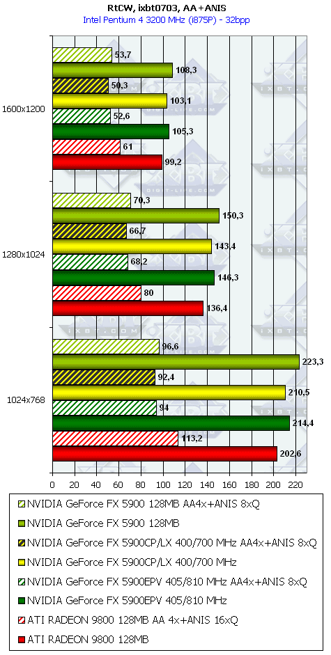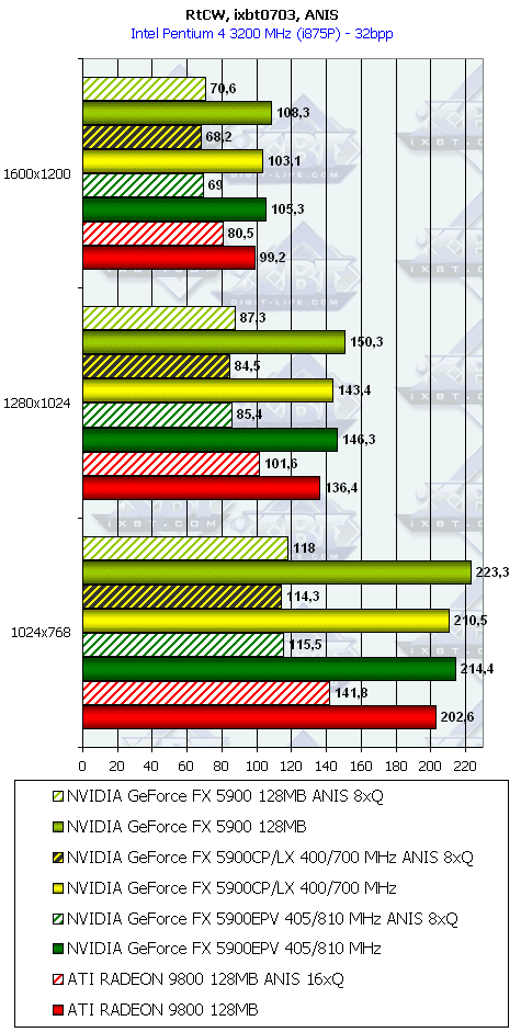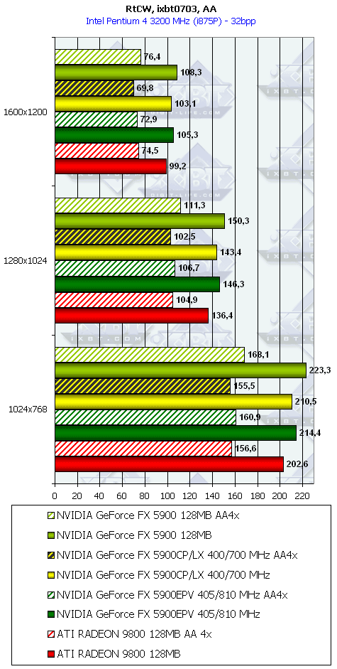 - Return to Castle Wolfenstein (MultiPlayer) (id Software/Activision) — OpenGL, мультитекстурирование, ixbt0703-demo, настройки тестирования — все на максимально возможном уровне, S3TC OFF, конфигурации можно скачать тут