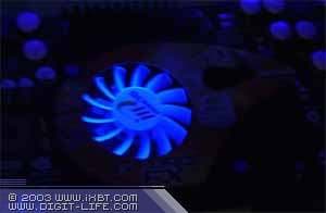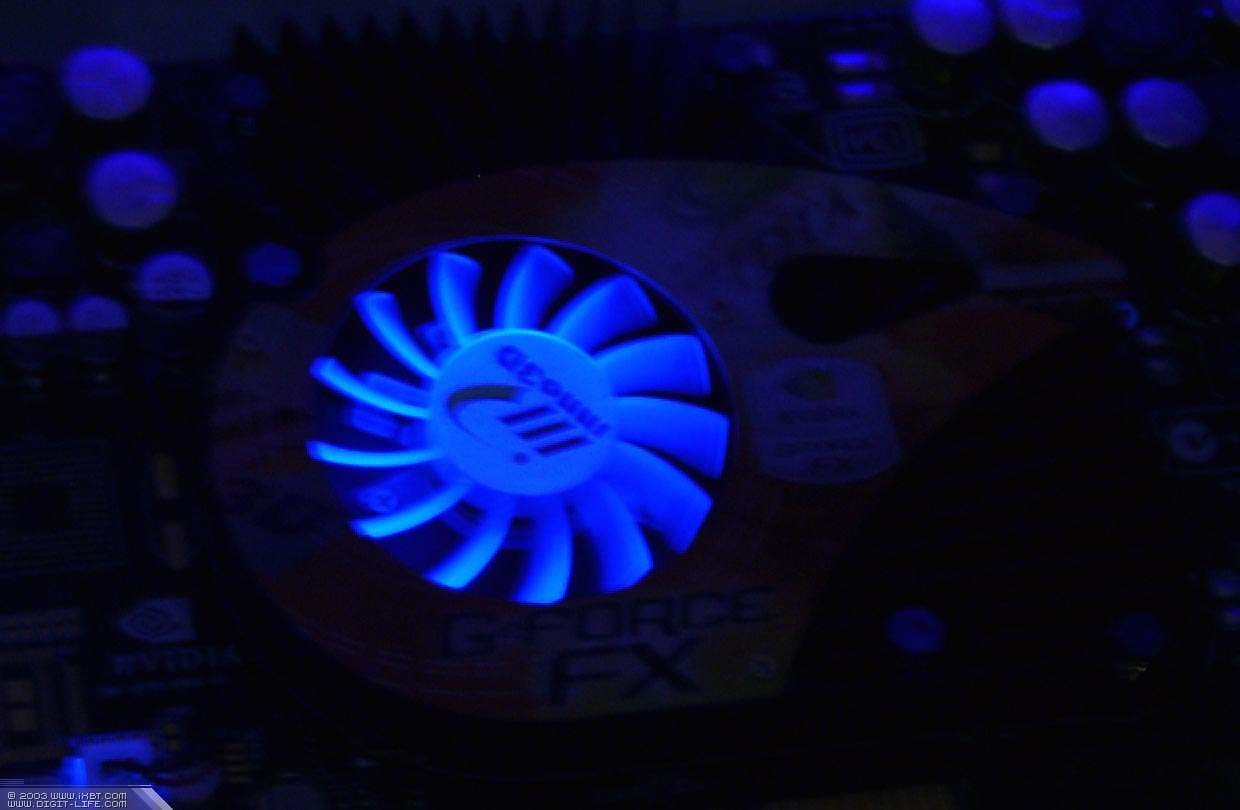 | А вот под маркой Inno3D мы видим где-то чуть более интересное решение. В целом, концепция та же, что и в предыдущем случае. Но вентилятор снабжен лопастями, светящимися в ультрафиолетовых лучах, а также есть эффектный ярко-синий светодиод, осуществляющий подсветку системы охлаждения. | ![]() |
