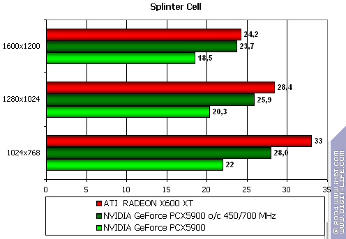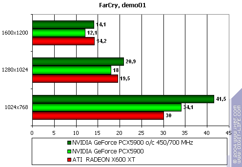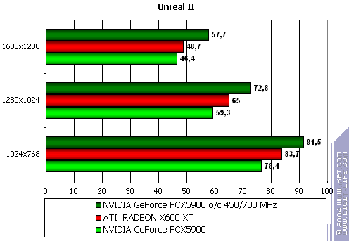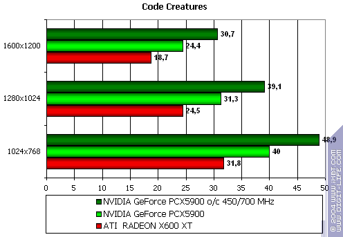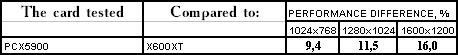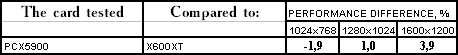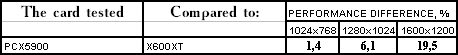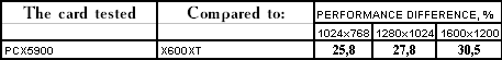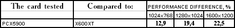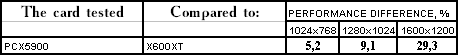 Этот тест явно любит текстурные блоки, а их у PCX5900 все же 8, а не 4, как у X600 XT, потому и победа первого очень убедительна.