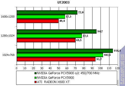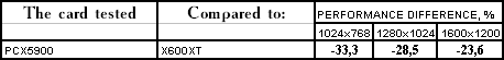 Думаю, что намек, данный в предыдущем пояснении, явно говорит о том, что где больше шейдеров, там больше шансов на успех у продуктов ATI (речь о сравнении с FX5900, разумеется). И даже число текстурных блоков не спасает PCX5900 от сильного поражения, ибо его хилые ALU не способны с той же скоростью работать с шейдерами, как у X600 XT.