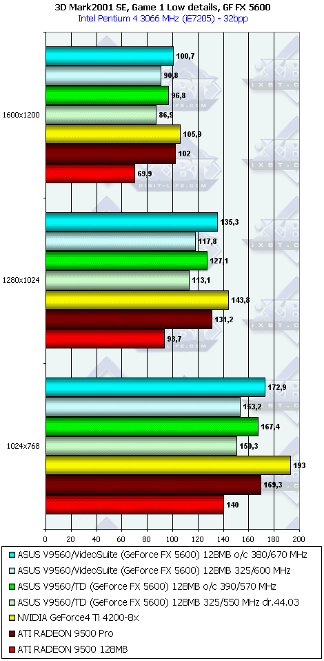 У 5200 картина несколько отраднее, однако только засчет того, что RADEON 9000 PRO не поддерживает DirectX 9.0.