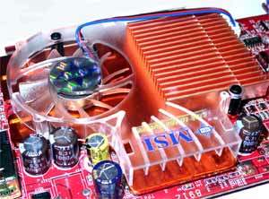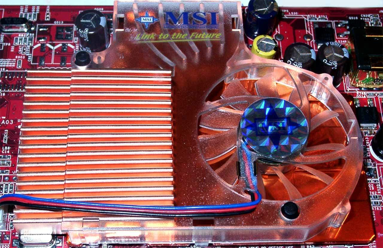 И все же, практически тот же набор, что и у GF4Ti: два гнезда (d-Sub, DVI), универсальное гнездо S-Video с поддержкой VIVO, соответствующий процессор Philips (у данной карты — 7114, ранее использовался 7108). Плюс уникальные разработки MSI: hardware monitoring, dual BIOS, свой кулер.
