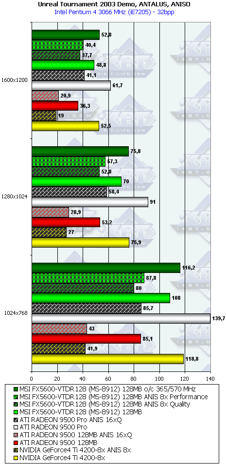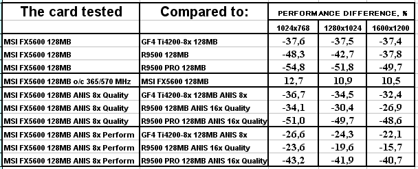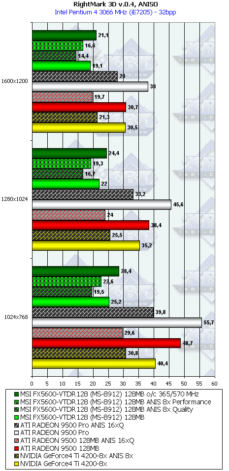 У NVIDIA ситуация схожа, однако более выгодная для американской фирмы, ибо новая линейка, занимающая по сути все ценовые ниши, кроме самой дешевой ($50 и ниже), поддерживает DirectX 9.0. А что со скоростью? А тут не лучше, чем у ATI: GeForce FX 5200 медленнее подчас, чем GeForce4 MX440-8x, GeForce FX 5600 тормознее GeForce4 Ti 4200-8x и т.д. Но! Не будем забывать, что у этих карт есть и анизотропия и АА! Если в отношении АА можно особо не расчитывать на дивиденды у GF FX, то анизотропия ведь очень соптимизирована! Вот сегодня мы этот вопрос и рассмотрим!