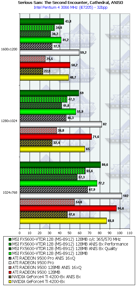 - Serious Sam: The Second Encounter v.1.05 (Croteam/GodGames) — OpenGL, мультитекстурирование, Grand Cathedral demo, настройки тестирования: quality, S3TC OFF