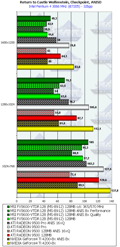 - Return to Castle Wolfenstein (MultiPlayer) (id Software/Activision) — OpenGL, мультитекстурирование, Checkpoint-demo, настройки тестирования — все на максимально возможном уровне, S3TC OFF, конфигурации можно скачать тут
