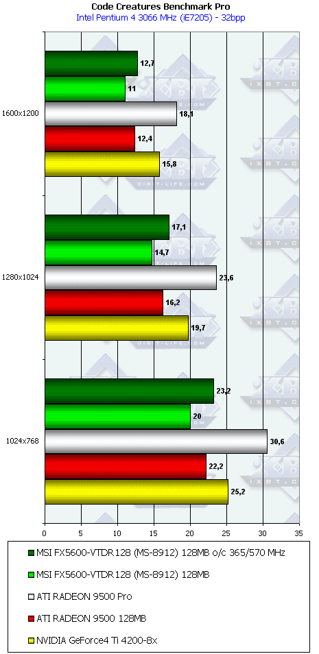 - Code Creatures Benchmark Pro (CodeCult) — игровой тест, демонстрирующий работу платы в DirectX 8.1, Shaders, HW T&L.