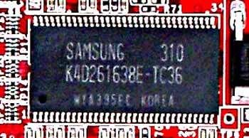 | Микросхемы памяти производства Samsung. Время выборки у микросхем памяти 3.6ns, что соответствует частоте работы примерно 275 (550) МГц, память работает на этой частоте. Частота работы GPU — 325 MHz. | ![]() |