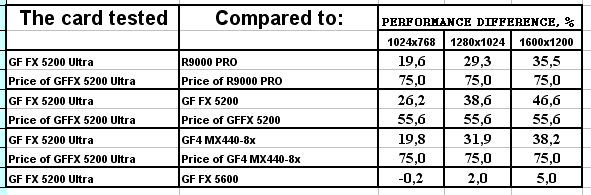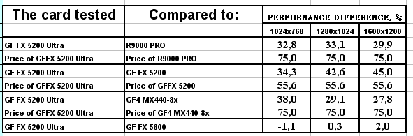 А вот тем, кто сейчас хочет модернизировать свою систему со старых акселераторов уровня GF2, RADEON 7200-7500 и даже GF4MX на что-то современное, чтобы увидеть игры с шейдерами или «поиграть» в «национальную компьютерную игру» 3DMark, тем можем смело посоветовать: не берите RADEON 9000 или GeForce4 Ti, обратите внимание на DX9-ускорители. Да, пока цены на них завышены, и потому сравнивать приходится весьма условно (170-долларовый GF FX 5600 с 130-долларовым GeForce4 Ti и т.д.). Однако в ценах на новинки есть большой резерв для снижения, поэтому можно быть уверенным что вскоре они обгонят старые ускорители по темпам падения цен и станут выгодными со всех точек зрения (вспомним про GeForce2 MX, когда он только через полгода после выхода начал становиться «народной» картой, вспомним и про GeForce4 MX и т.д.).