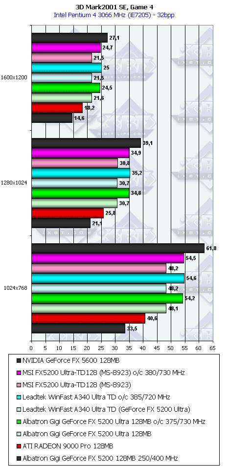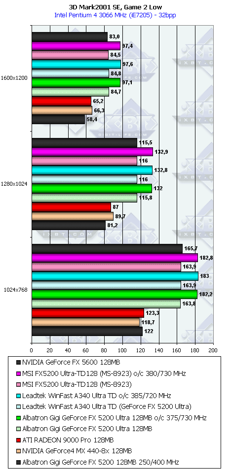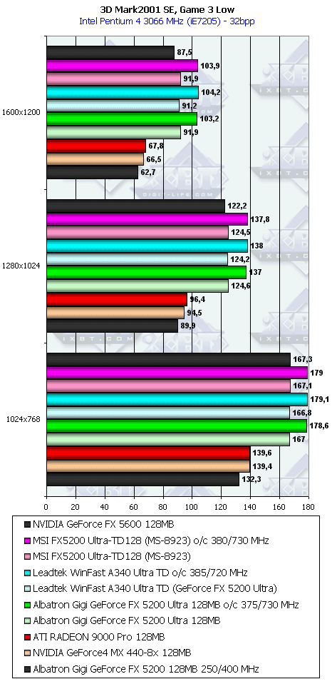 - Albatron Gigi GeForce FX 5200 Ultra 128MB — копия эталонной карты, ничем особенным эта карта не обладает, учитывая традиционно низкие цены на продукты этой компании, плата может стать хорошим выбором для тех, кто хотел бы купить что-то из области RADEON 9000 PRO или даже RADEON 9500 (при условии, что цены опустятся до приемлемых);