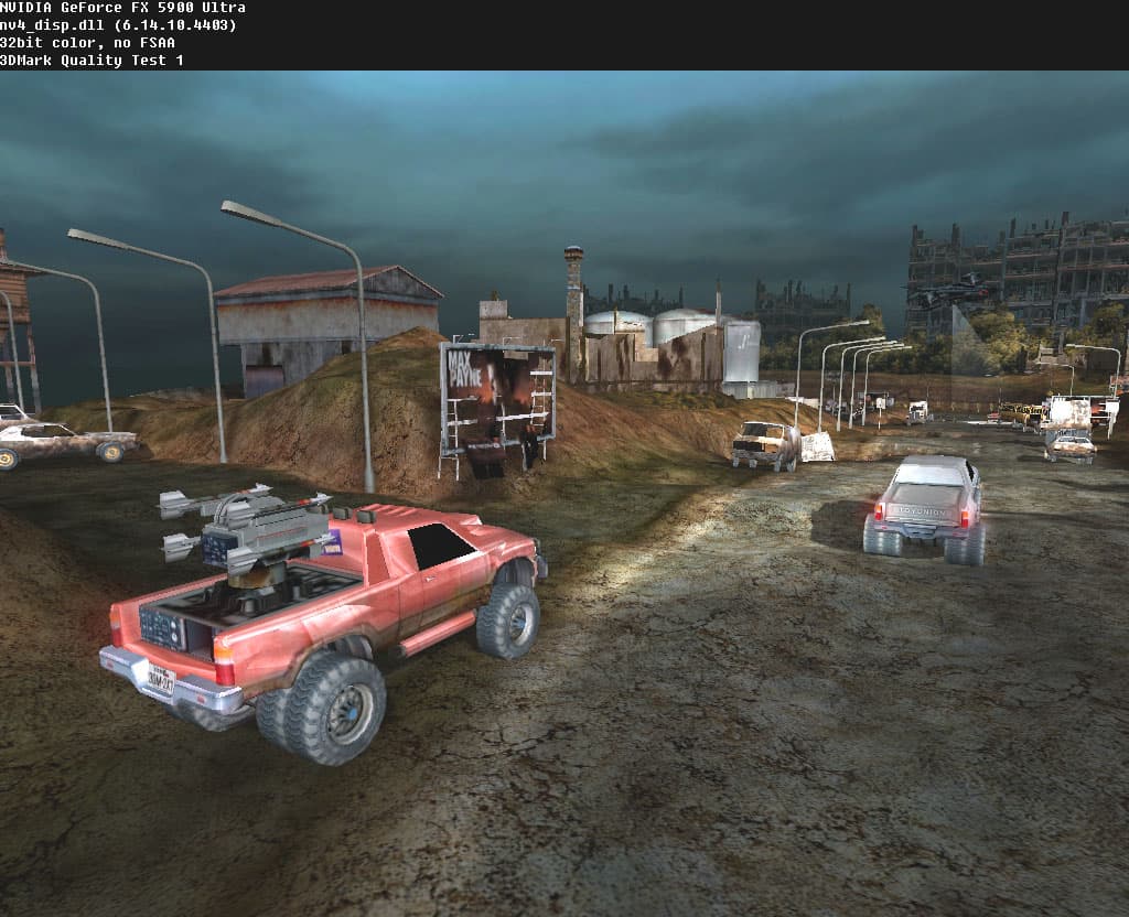 - DirectX 9.0 тест; примерно 780 000 полигонов в сцене, под текстуры используется 50 мегабайт видеопамяти, 54 мегабайт для буферов под вершины и 9 мегабайт для индексов.