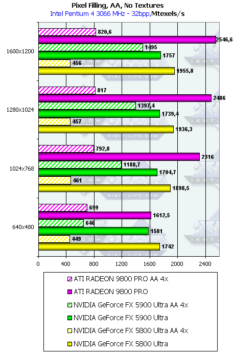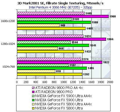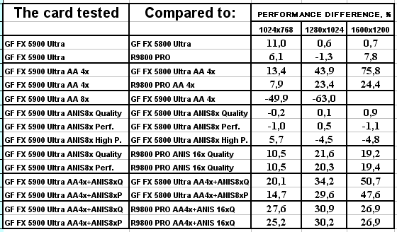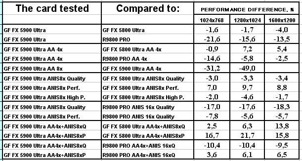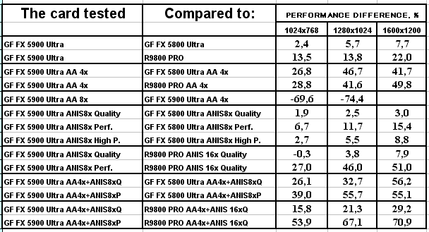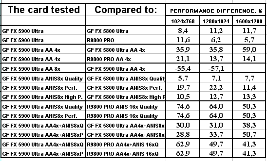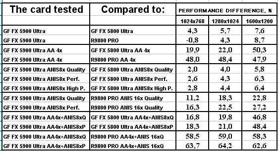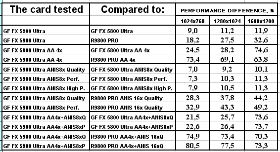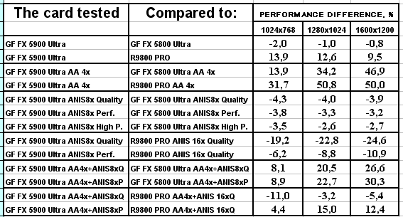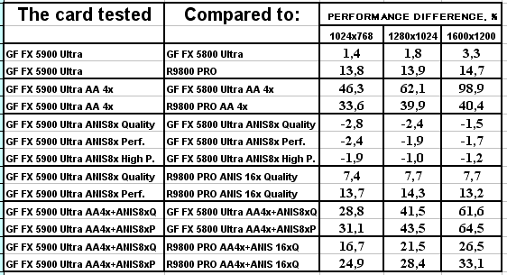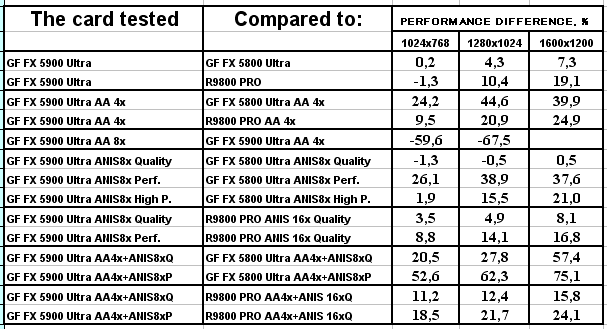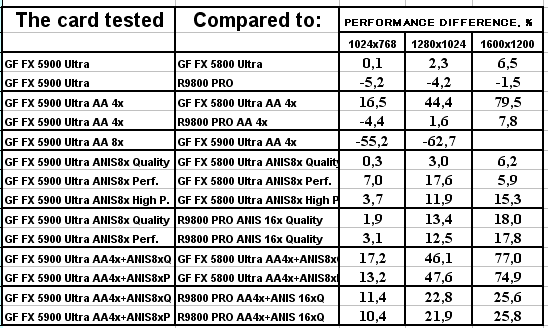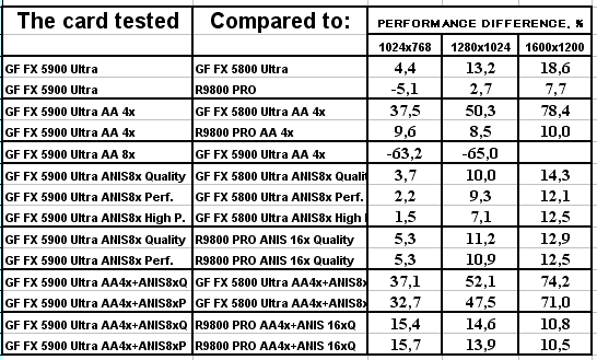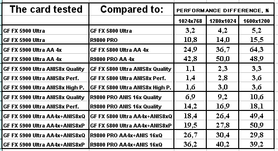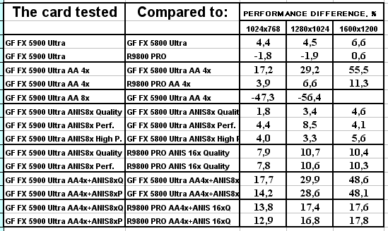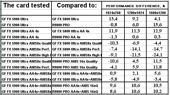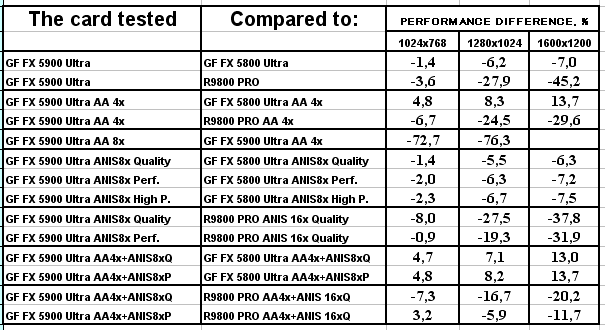 Ну что можно сказать? Почти сбываются обещания NVIDIA обогнать RADEON 9800 PRO в режимах с АА и анизотропией на 50-80%. Так оно и есть! 256-битная шина очень помогает NV35 добиться успеха в АА. Да и анизотропия весьма хороша: посмотрите, частоты ниже, а скорость выше (я про сравнение NV35 и NV30). Снова вспоминаем материал Алексея Николайчука.