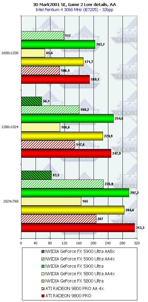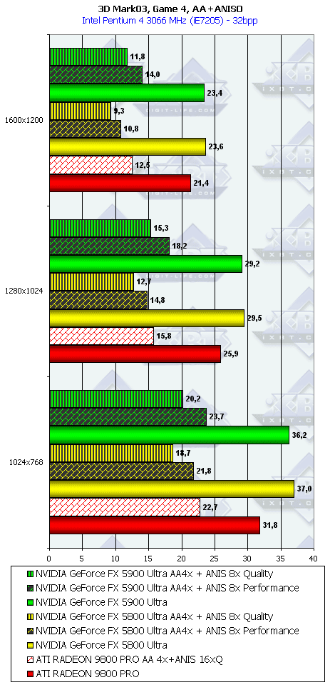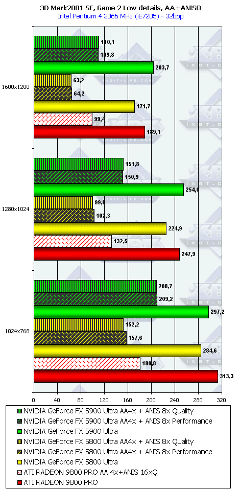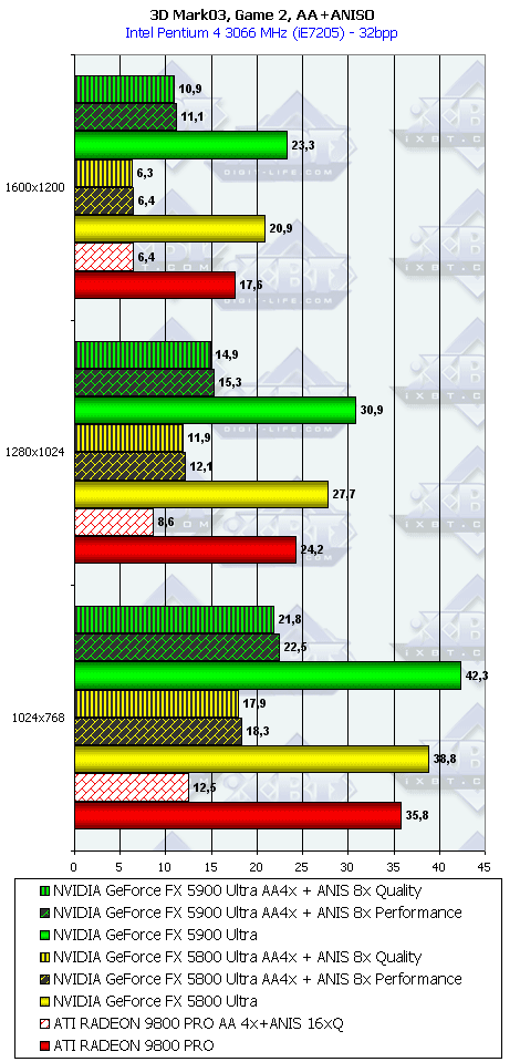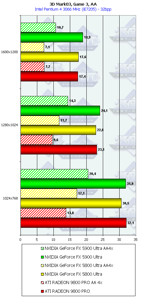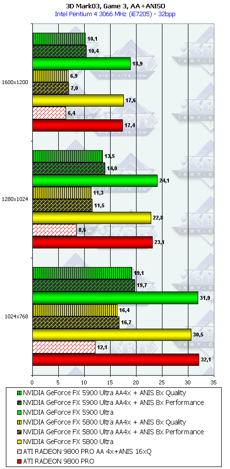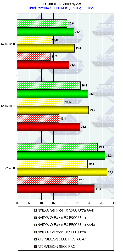Как ни странно, но в данном тесте случился провал у NV35 с анизотропией даже относительно NV30 (по всей видимости, драйверы не были оптимизированы под данный тест), а превосходство с АА не столь велико, поэтому суммарное преимущество NV35 в комплексном тесте очень мало.