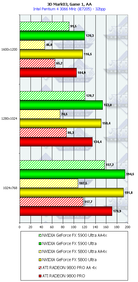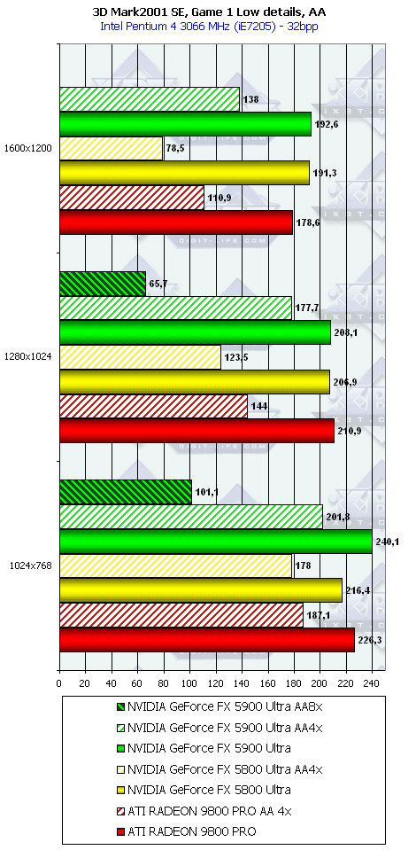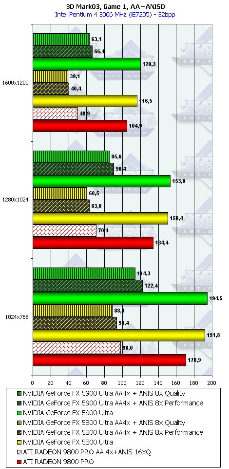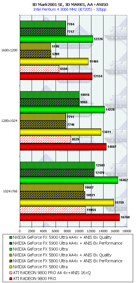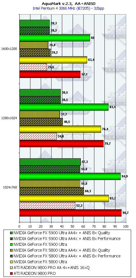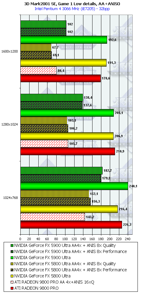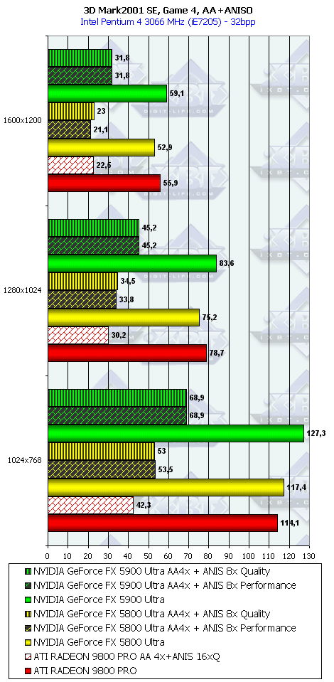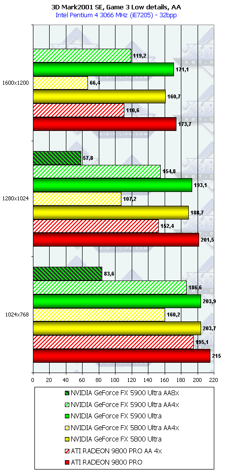 Как ни странно, но в данном тесте случился провал у NV35 с анизотропией даже относительно NV30 (по всей видимости, драйверы не были оптимизированы под данный тест), а превосходство с АА не столь велико, поэтому суммарное преимущество NV35 в комплексном тесте очень мало.