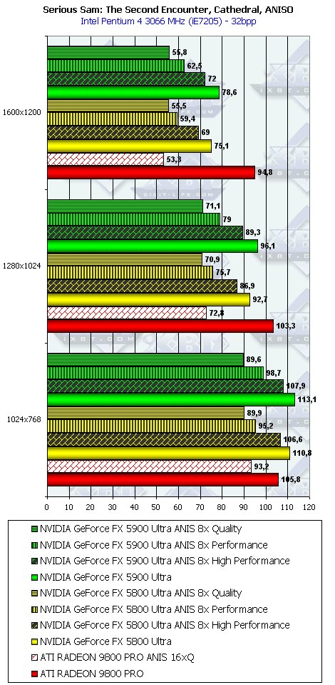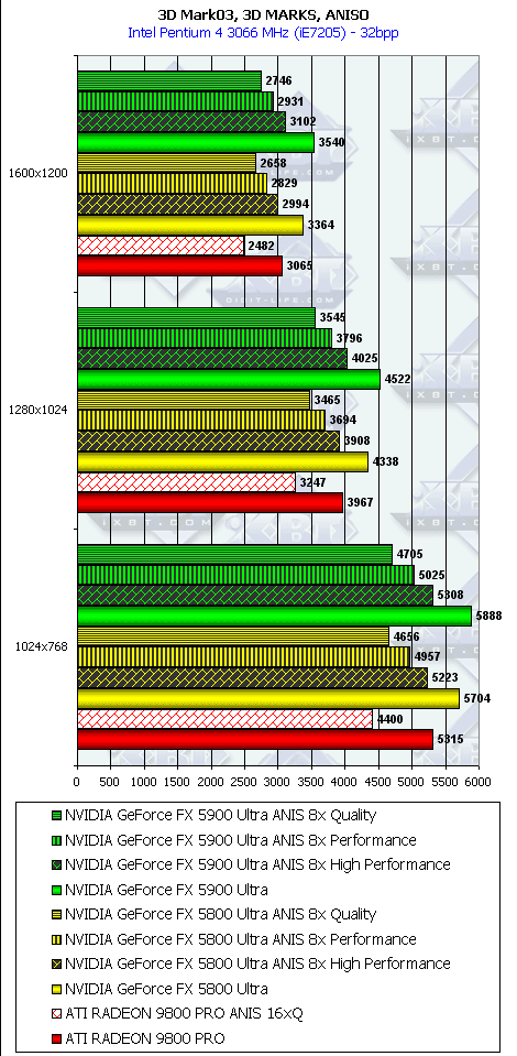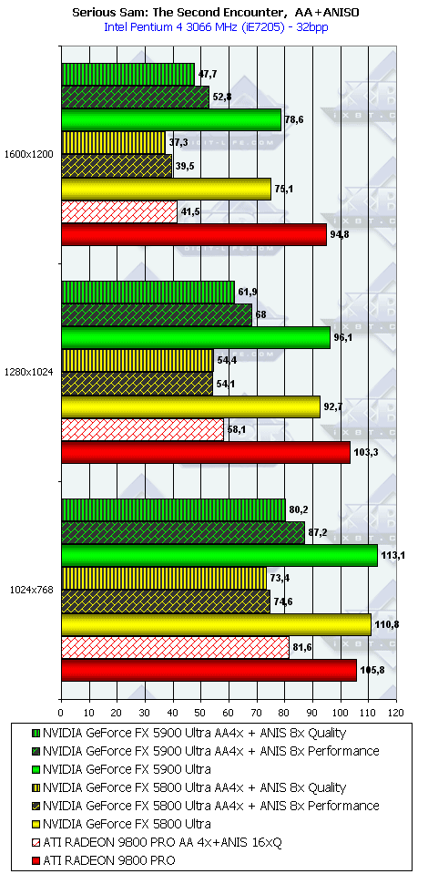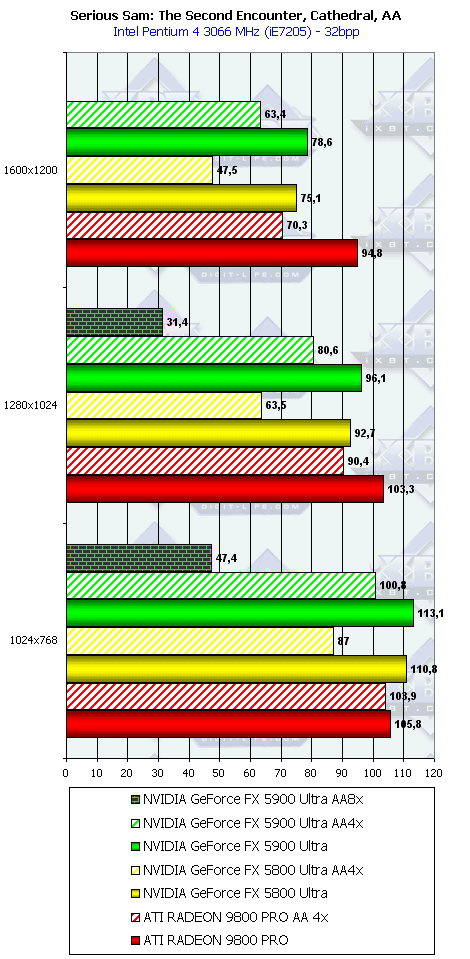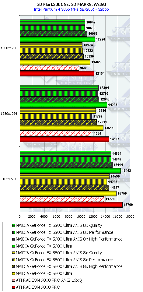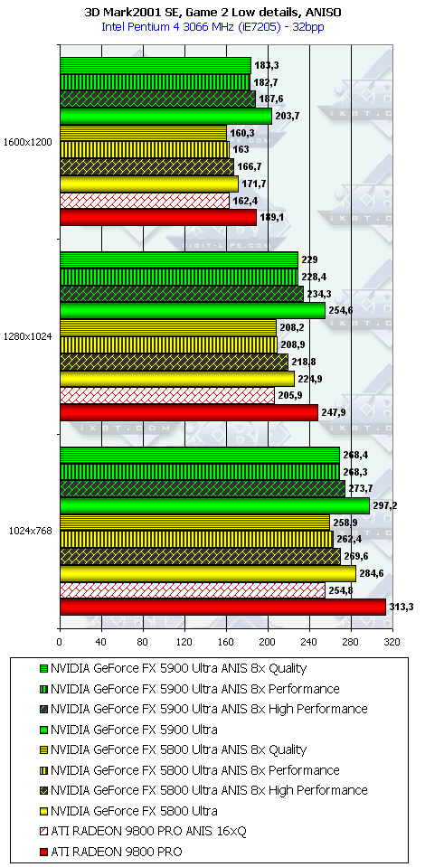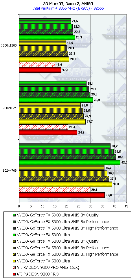 К очень большому сожалению, в этом тесте у NV30/NV35 не работает анизотропная фильтрация, поэтому протестировать эти режимы, а также комплексные с АА и анизотропией, не получилось. Это также прокол программистов NVIDIA, как было и есть в отношении игры Elder Scrolls III: Morrowind, где точно такая же история, но в отношении АА (работает только один режим 4xS!).