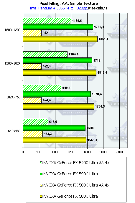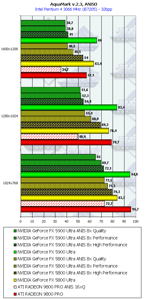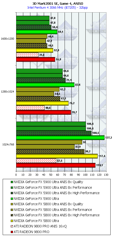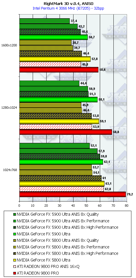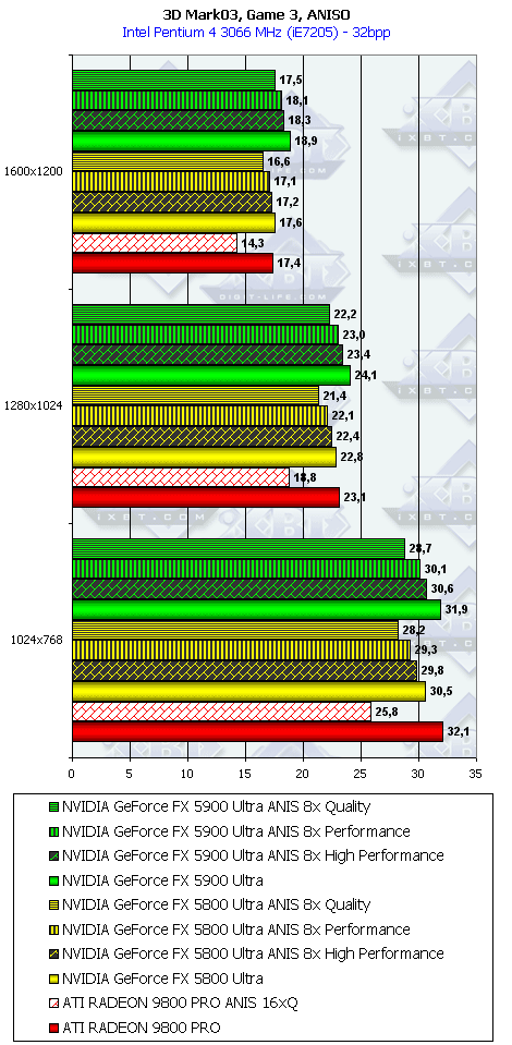 - А вот в этом пакете, где тесты достаточно сложны (или, вероятно, из-за недостаточной оптимизации драйверов под этот тест), скорость анизотропии у NV35 подчас чуть ниже, чем у NV30. Тут уже играют роль более низкие частоты у первого.