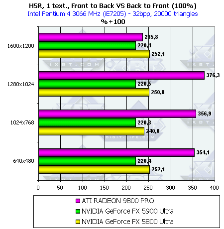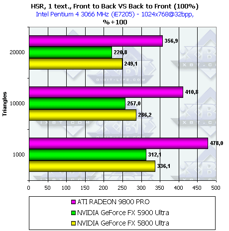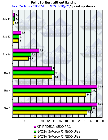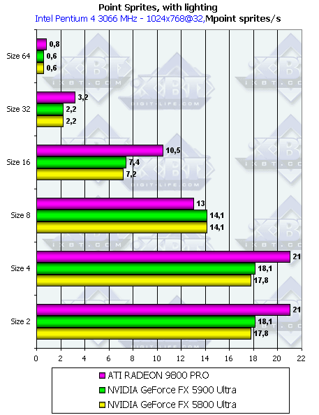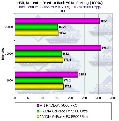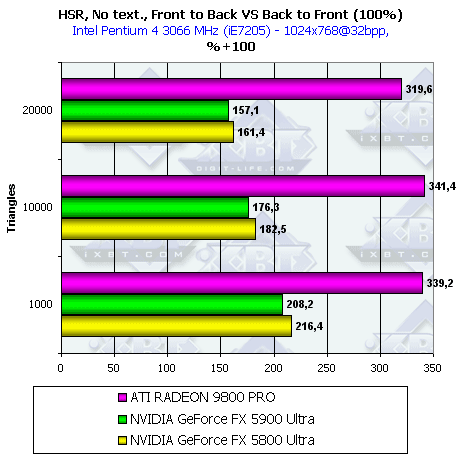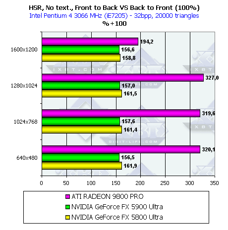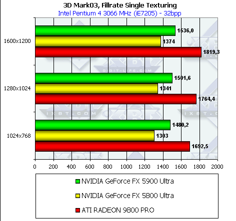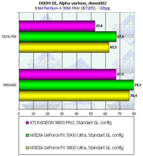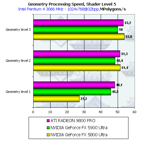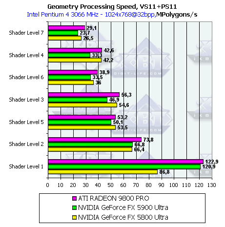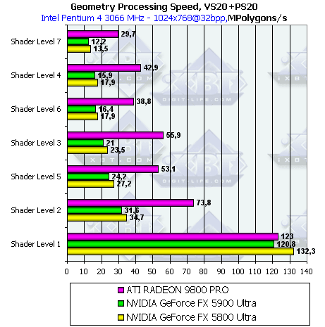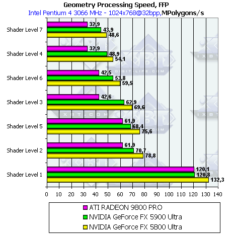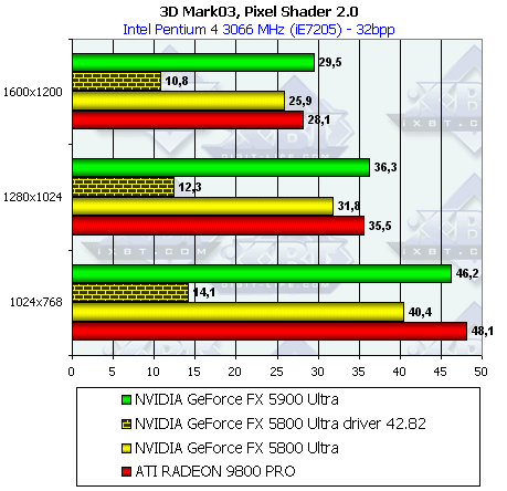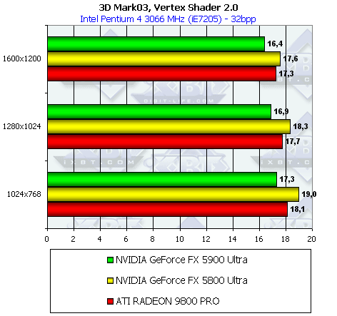 Под этот тест нет оптимизаций драйверов (поскольку самого теста не было ранее в Сети), колоссальную роль играет скорость работы пиксельных шейдеров, и, как мы видим, поражение NV35 налицо от своего же старшего собрата NV30 (частоты работы ядер снова играют главенствующую роль).