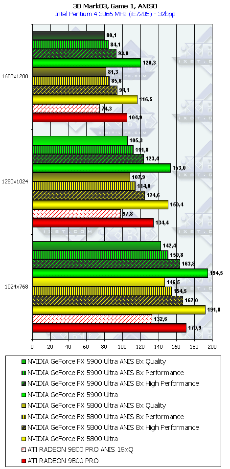 (256 / 8 * 850) / (128 / 8 * 1000) = 27200 / 16000 = 1.7 раза. Это же сильно помогло карте выиграть и в комплексных тяжелых режимах с АА и анизотропией. И это все, несмотря на уменьшившиеся частоты работы как самого процессора (450 против 500 МГц), так и памяти (425 против 500 МГц). - Алгоритм анизотропии не претерпел изменений, однако, как мы видим, программисты NVIDIA усиленно работают над оптимизациями этой функции (более подробно о подобном в OpenGL можно прочитать в статье Алексея Николайчука AKA Unwinder). Причем, работа идет в целом по семейству GeForce FX, а не только по NV35, поэтому мы видим, что на последней версии 44.03 скорости анизотропии у NV30 и NV35 иногда почти равны. Интересно отметить, что специфика анизотропии от NVIDIA такова, что почти вся нагрузка ложится на чип, и поэтому логично было бы ждать более низких результатов у NV35 из-за более низкой частоты работы GPU, однако все же процессор оптимизировали и с точки зрения скорости выполнения этой функции.