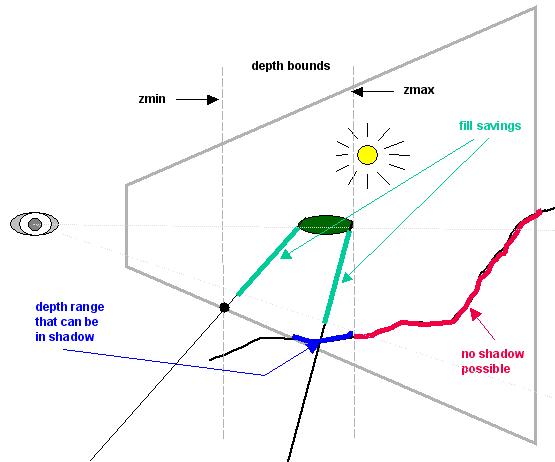 - Технология UltraShadow: Данная технология позволяет увеличить скорость визуализации теней при использовании техники стенсил-буфера (stencil buffer shadows), как раз той техники, которая используется в Doom III. Как часть технологии UltraShadow декларируется возможность чипов NV30/NV35 удваивать fillrate, выдавая до 8 пикселей за такт, если закрашивается только буфер глубины и/или стенсил буфер, по сравнению с 4 пикселями при обычном рендеринге. Вторая, наиболее интересная часть заключается в возможности задавать диапазон глубины в кадре, в котором объект может отбрасывать тень. Для демонстрации взглянем на рисунок: