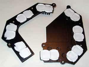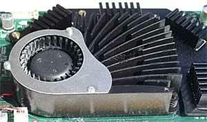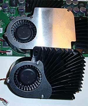 | Что касается системы охлаждения, то она состоит из двух кулеров: для процессора и для памяти, что является очень верным решением (мы уже неоднократно отмечали, что единый кулер для GPU и памяти может сыграть злую роль для менее нагревающихся элементов, неся к ним тепло от более сильногреющихся компонентов). Центральный кулер представляет собой копию того, что мы могли видеть ранее на Quadro FX или GeForce FX 5800 (не-Ultra), только с обрезанной крышкой на радиаторе, что способствует уменьшению шума. Вентилятор работает в режиме, как у GeForce FX 5800-не-Ultra: постоянно крутится на малых оборотах, при надобности включаясь на полные обороты (при повышении температуры выше определенных критических значений). Система охлаждения памяти состоит из двух массивных алюминиевых радиаторов, покрашенных в черный цвет. Тепло передается через специальные термоэлементы, приклеенные к радиаторам, они же гарантируют плотный прижим к поверхности микросхем памяти. Сам крепеж системы охлаждения тщательно продуман, нет больше никаких пластмассовых клипс (фитюлек), все на болтах с пружинами. | ![]() |